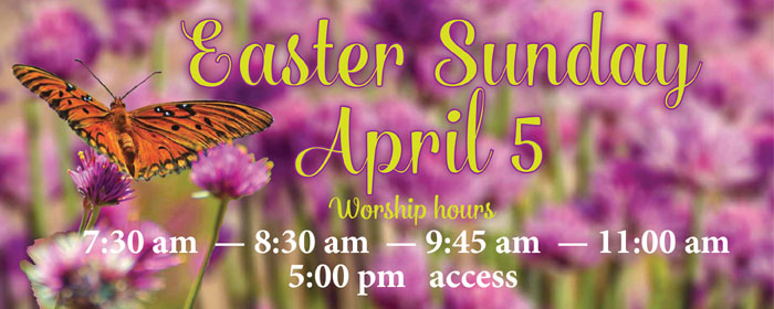 Palm SundayMarch 29Bishop Michael McKee will preach at traditional worship services, 8:45, 9:45, 11 am. (See Guest Speakers tab) Noon at FirstMar 30 - Apr 1, Bartula Family Life CenterLunch service begins at 11:45, $7 per day, $20 for all 3 days or bring your own lunch Monday, My Journey with Jesus, John & Diana Holbert (See Guest Speakers tab) Maundy Thursday Service Apr 2, 7 pm, SanctuaryA family service in a beautiful garden setting in the sanctuary in the style of Taizé with communion. The Chancel Choir will lead us in magnificent music. Good Friday ServiceApr 3, 7 pm, SanctuaryThe Seven Last Words: A service of darkness as we remember this holiest of days in our Christian faith. Easter Eve Service of Baptism and Joining